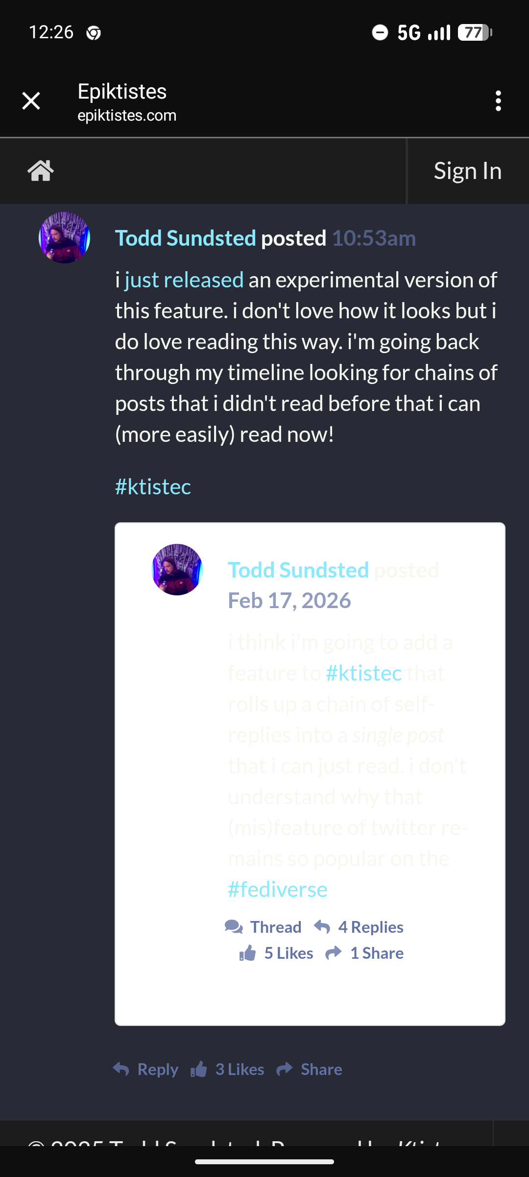 i think i'm going to add a feature to #ktistec that rolls up a chain of self-replies into a single post that i can just read. i don't understand why that (mis)feature of twitter remains so popular on the #fediverse